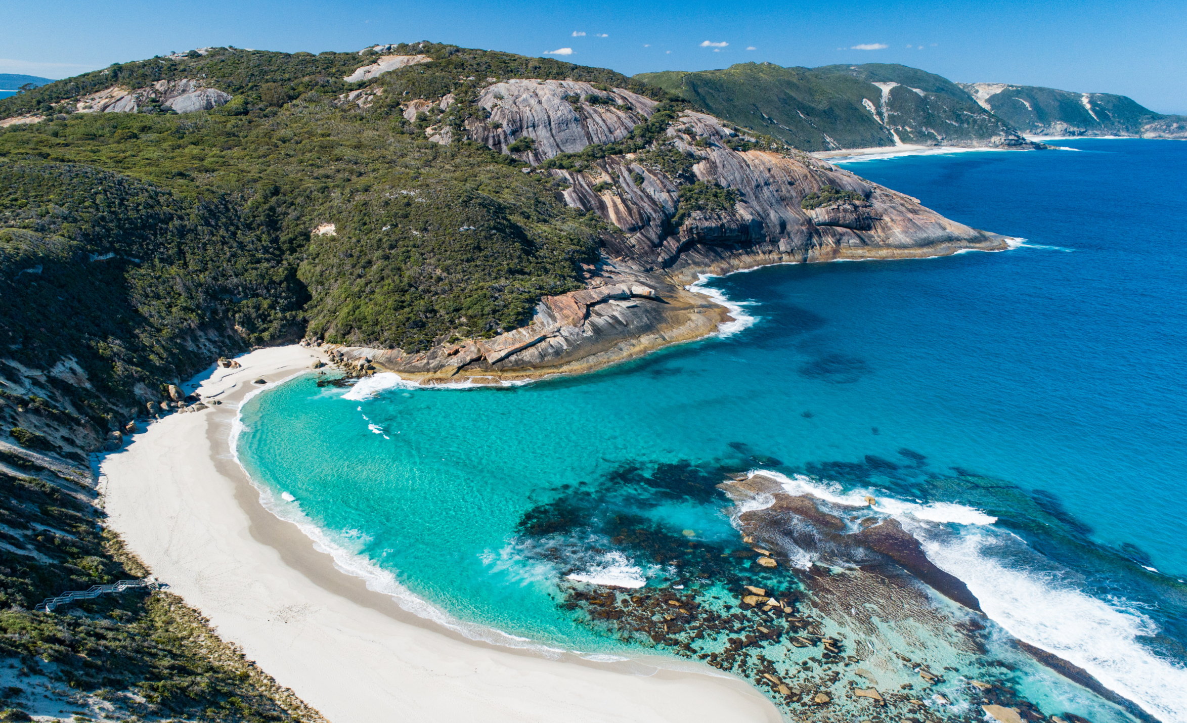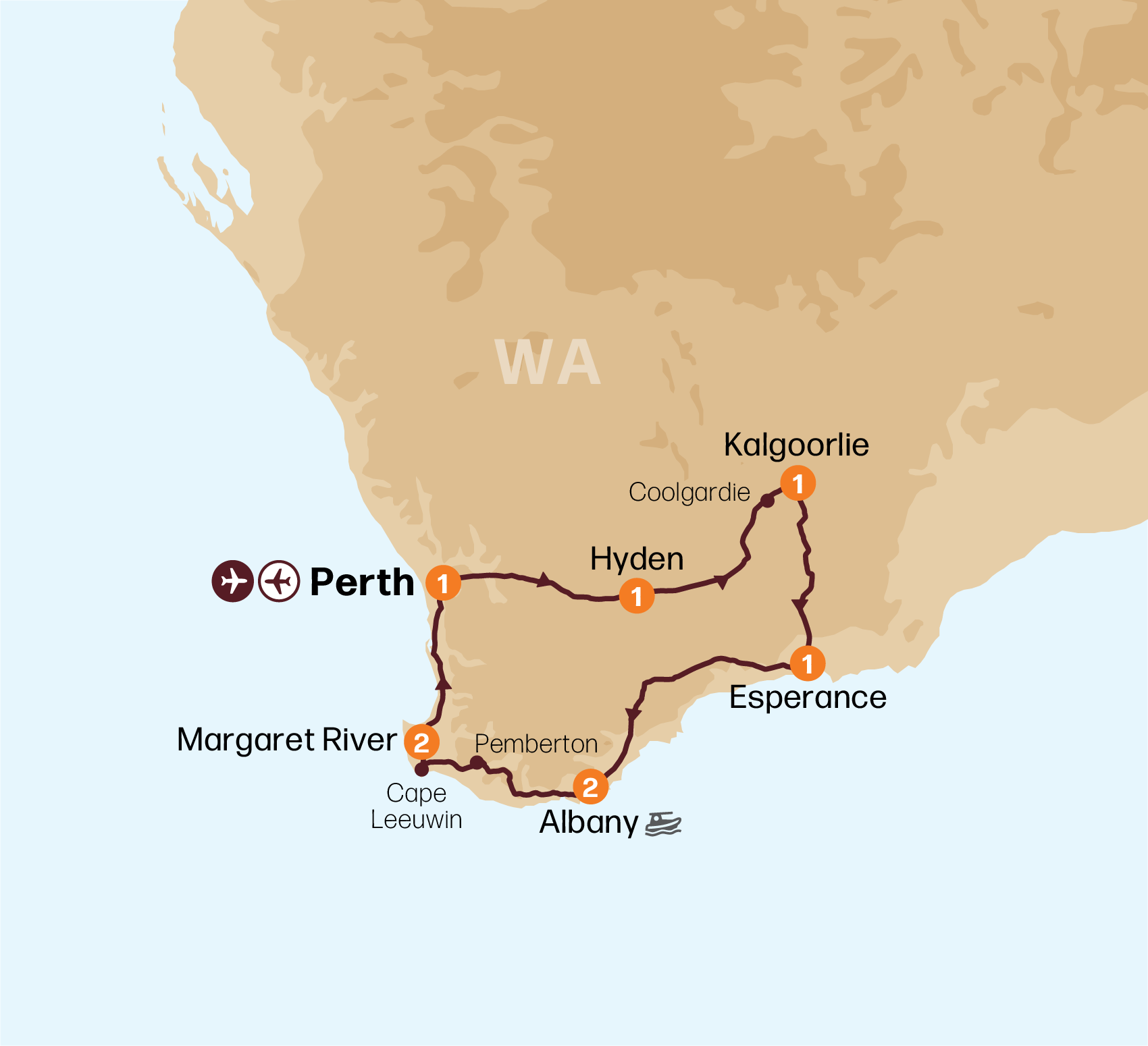 Changing course towards the south, we venture through Kambalda and Norseman to the seaside town of Esperance. Along the way, there are often spectacular wildflower displays that we will stop to admire. Upon our arrival at the coast, we take the scenic Great Ocean Drive, which includes Rotary Lookout and showcases Esperance’s spectacular coastline of tranquil bays, soaring cliffs and beautiful beaches. Meals (B.L.D)