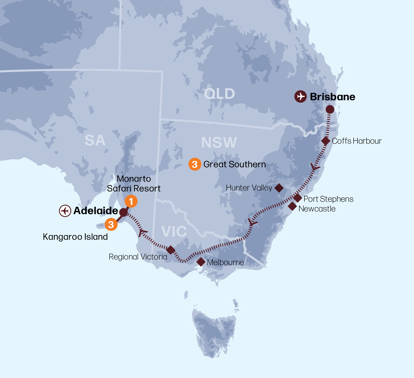 Your Outback Spirit crew will introduce you to our state-of-the-art Mercedes-Benz coach and its many comforts before we head into the Adelaide Hills to the quaint village of Hahndorf. Welcome to Australia’s oldest surviving German settlement - bratwurst anyone? This heritage town is full of history and character. Enjoy time for a quick wander and some window shopping before continuing to Monarto Safari Resort, today’s destination and a jewel in the crown of South Australian touring. Prepare for authentic wildlife experiences as ‘Africa’ is brought to life in our own backyard. A sunset wildlife safari, enjoyed from a comfortable safari truck, will get us up close and personal to free-roaming animals such as cheetah, zebra, giraffe, rhinos and more. Compare sightings over dinner on-site which will feature locally sourced ingredients and produce. L.D